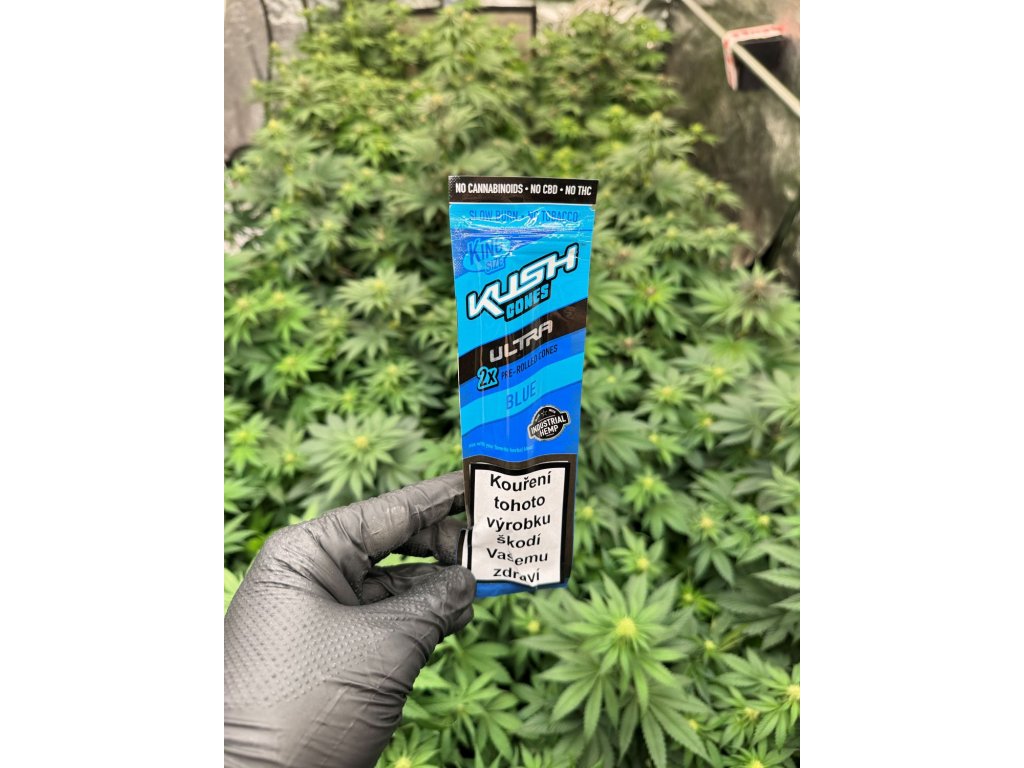 Nové ochucené předrolované blunty Kush Conical Herbal Hemp wraps, které jsou speciálně vyrobeny z lisovaného technického konopí a neobsahují tak žádný tabák ani nikotin. Jedno balení obsahuje dva kusy předtočených ochucených bluntů z technického konopí v příchuti Ultra Blue - borůvka.
