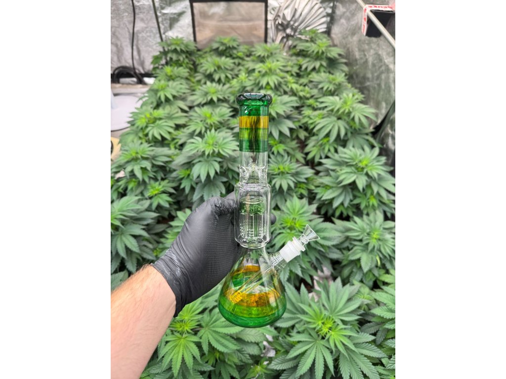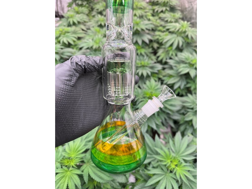 Skleněný bong bez loga s 8-arm perkolací v zelené barvě o výšce 30 cm.