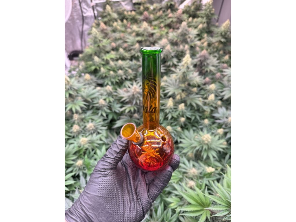 Skleněný mini bong v základním tvaru v rasta barvách o velikosti 16 cm s originálním motivem.