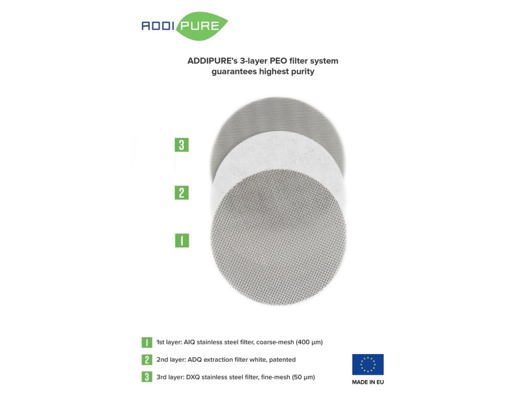 Balení obsahuje 10 kusů patentovaných extrakčních filtrů ADQ, které jsou určeny pro extraktory AddiPure o průměru 35 mm (jako je model P-60/35).