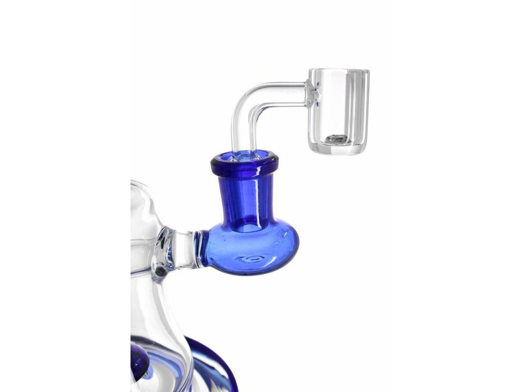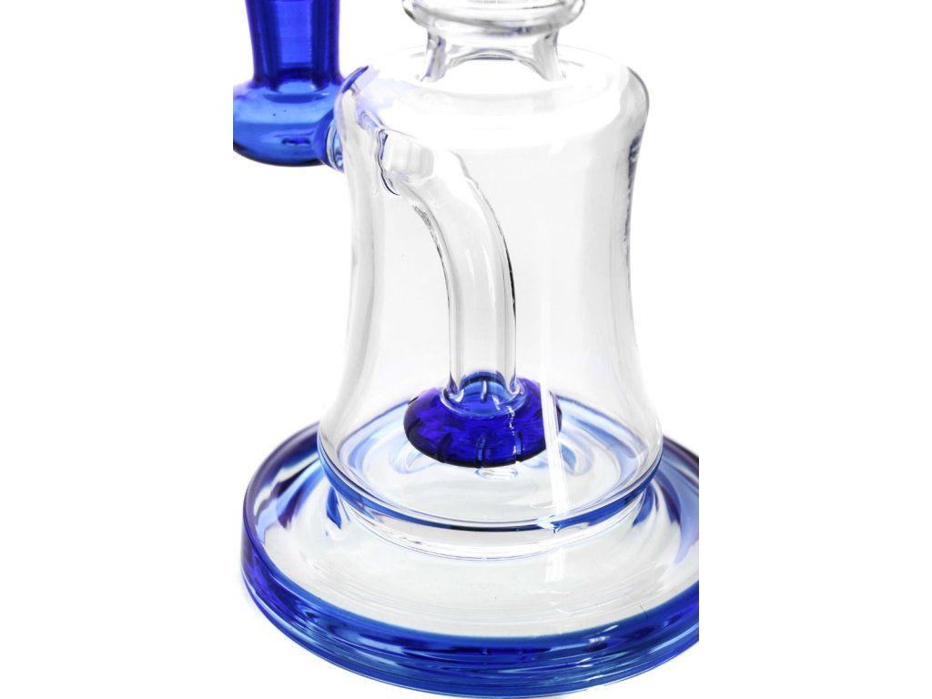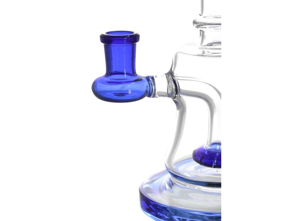 Skleněný bong menší velikosti cca 19 cm s originální dizajnem, perkolátorem uvnitř a olejovým kotlem. Díky tomuto malému bongu si můžete vychutnat olejové extrakty i na cestách mimo domov kam se nehodí brát velké bongo.
