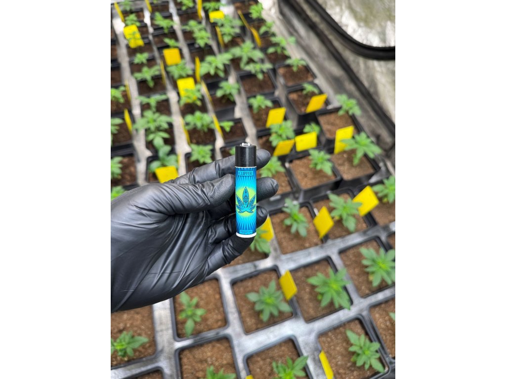 Clipper zapalovače ve velikosti Classic z kolekce nazvané Flash Leafs, která je potištěna konopnými listy v různých barevných kombinacích se zajímavým ornamentem. Jedny rty jsou doplněné o konopné listy, další drží žiletku zatímco třetí mají mezi zuby náboj z pistole.