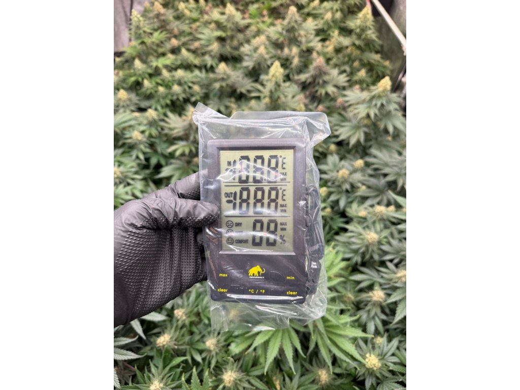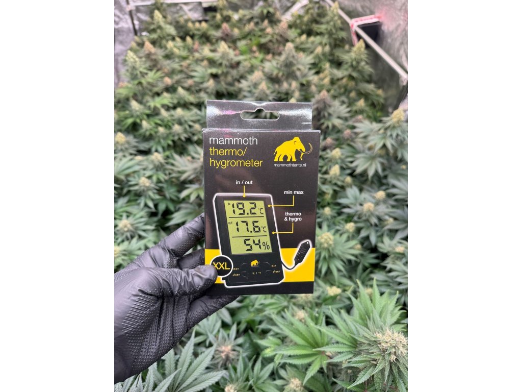 Hodnoty vlhkosti a teploty jsou během pěstování rostlin jedněmi ze základních ukazatelů, které je potřeba pečlivě sledovat. Přílišné teploty či vlhkost mohou nepříjemně ovlivnit kvalitu sklizně, způsobit plísně či vysušit květy rostlin až k smrti. Digitální teploměr značky Mammoth v provedení XXL je velmi kvalitně provedený, má několik základních tlačítek pro restart, nastavení °C/°F, a zobrazení max/min hodnoty. Teploměr má kvalitní a velký LCD displej, měří teploty v rozmezí od 0°C do 50°C a pohání ho 1xAAA baterie, která je součástí balení. Teploměr a vlhkoměr měří s přesností ± 1 ° C a vlhkost ± 5%.