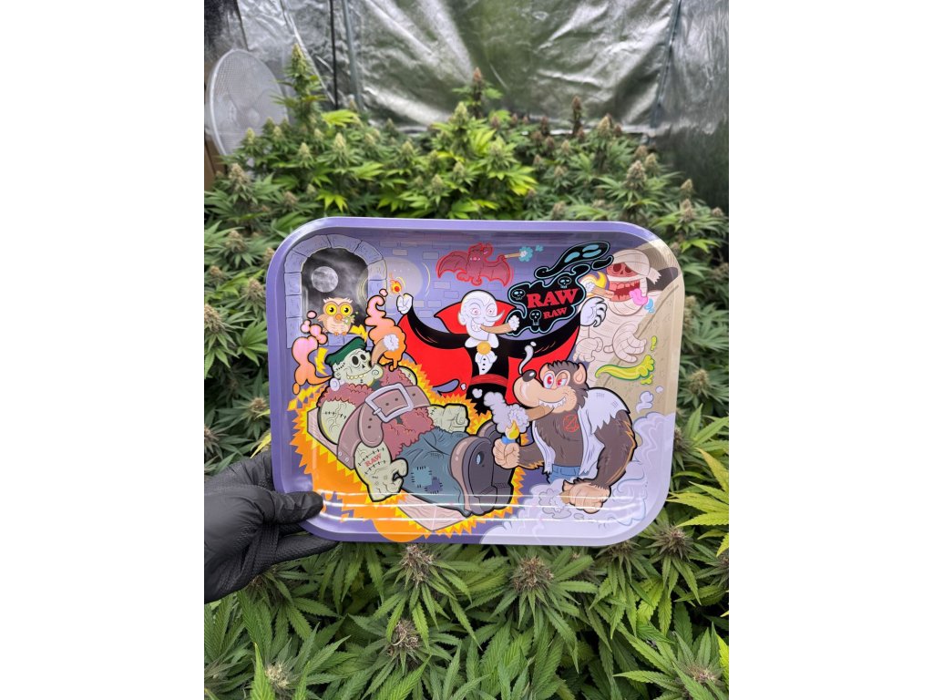 Velký kovový podklad RAW XXL s názvem Monster Sesh, nebo-li sešlost monster znázorňuje skupinku kreslených postav z animovaných filmů, které se sešli na tzv. "kouřovou pauzu" při úplňku. Tato balící podložka RAW tak obsahuje mix postaviček, mezi kterými najdete např. Drákulu či Frankensteina. Na podložce na balení cigaret najdete také logo této celosvětově oblíbené firmy.