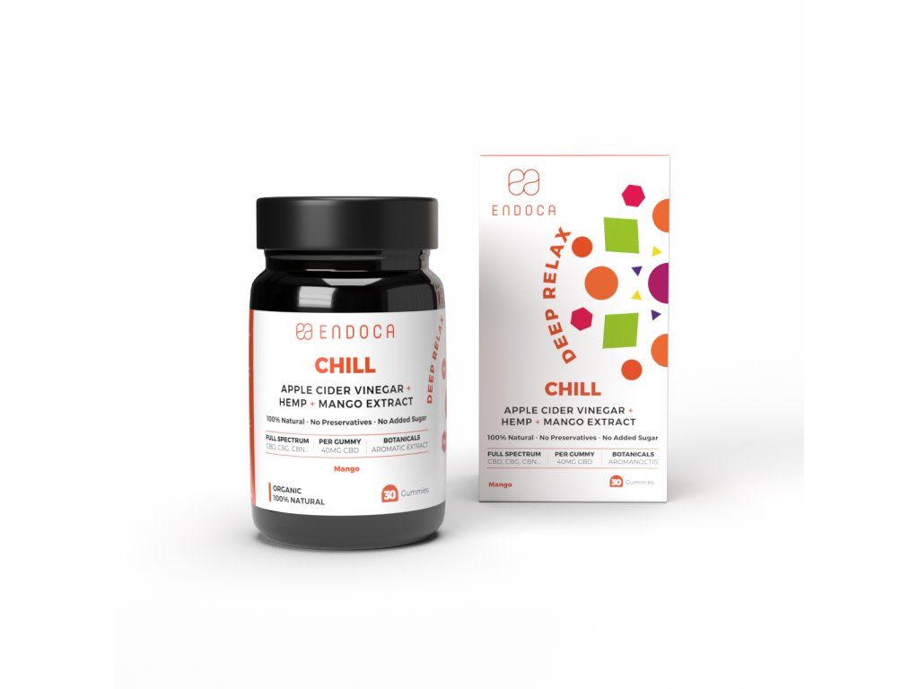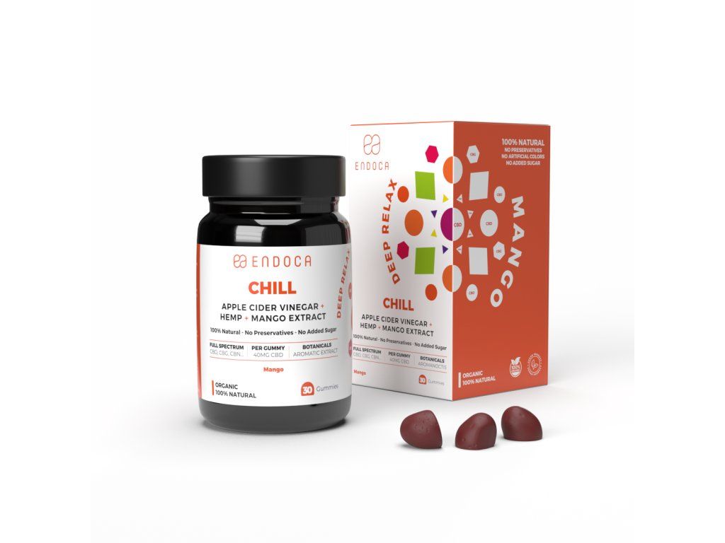 Sladké gumové bonbóny s názvem "Chill" ze Skandinávské společnosti Endoca s vysokým obsahem CBD a 0 % THC. Bonbóny s názvem Chill mají exotickou příchuť manga a čistě přírodní složení, které podporuje odpočinek a uklidňuje mysl. Každý bonbón obsahuje 40 mg konopného oleje z organicky pěstovaných rostlin s 0 % obsahem THC. Mangová příchuť dodává bonbónům exotickou chuť, kterou tyto bonbóny získávají z organického extraktu z manga. Jako konzervant je použit jablečný ocet, který nejen prodlužuje trvanlivost této sladkosti, ale navíc má také velké množství potenciálních benefitů pro naše zdraví.