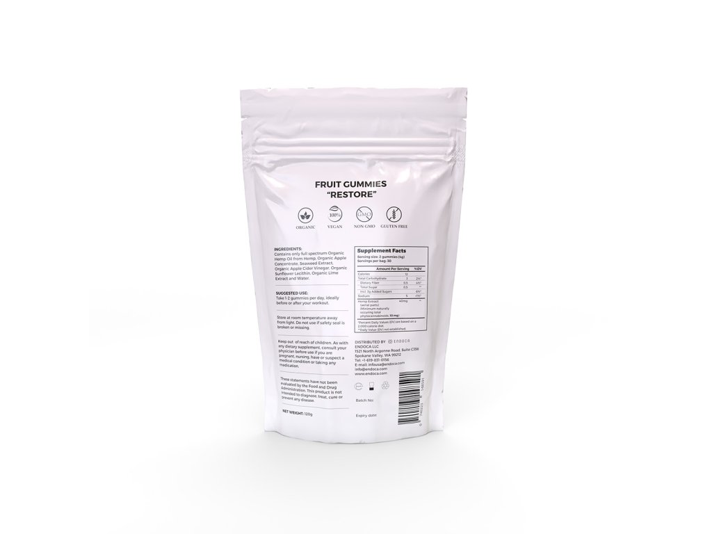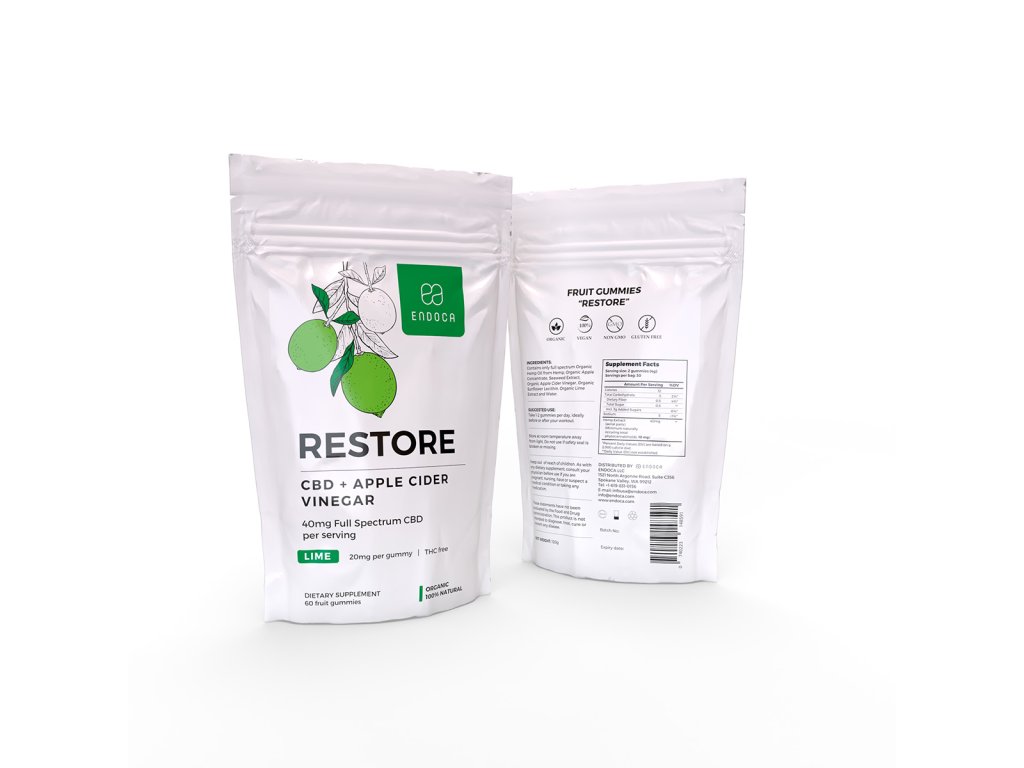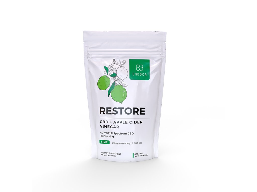 Sladké gumové bonbóny s názvem "Restore" ze Skandinávské společnosti Endoca s vysokým obsahem CBD a 0 % THC. Bonbóny s názvem Restore mají limetkovou příchuť a čistě přírodní složení. Každý bonbón obsahuje 20 mg konopného oleje z organicky pěstovaných rostlin s 0% obsahem THC. Limetková příchuť dodává bonbónům specifickou chuť, kterou sladkost získává z organického limetkového extraktu. Jako konzervant je použit jablečný ocet, který nejen prodlužuje trvanlivost této sladkosti, ale navíc má také velké množství potenciálních benefitů pro naše zdraví.