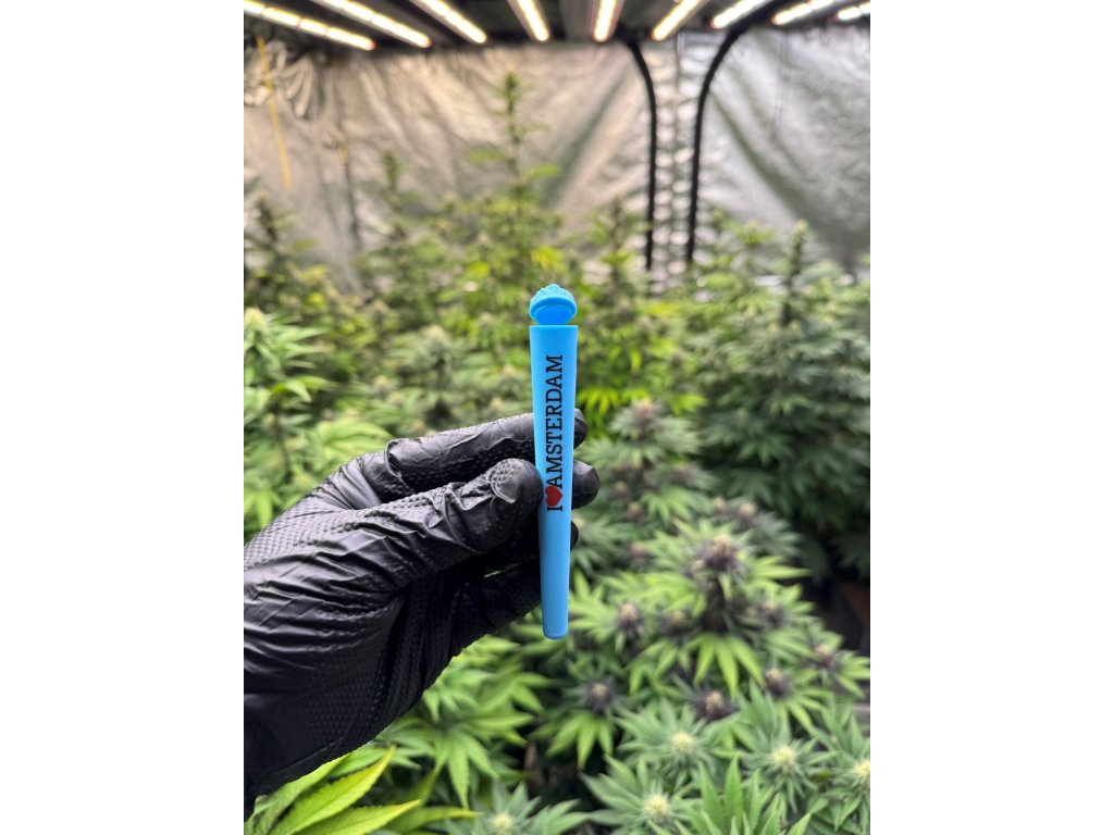 Praktický znovu uzavíratelný obal na joint v modré barvě s motivem konopí vyrobený z kvalitního tvrzeného plastu v rozměru King Size.