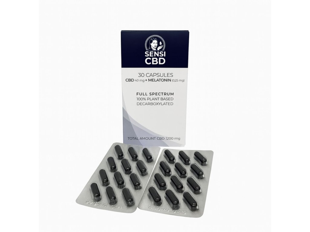 Konopný CBD olej v kapslích, nebo-li tobolkách v balení po 30 kapslích a s celkovým obsahem CBD 1200 mg a přidaným melatoninem. Konopný olej pocházející z organicky pěstovaného konopí vznikl přimícháním rafinovaného konopného extraktu do oleje lisovaného ze semen konopí. Olej navíc obsahuje ještě přírodní antioxidant vitamín E (tocopherol extract) + melatonin, který podporuje lepší spánek a zlepšuje odpočinek těla. CBD olej v tobolkách je veganský a obsahuje jen stopové množství psychoaktivního THC (0,005%), takže je legální i v zemích kde je povolen obsah do 0,2%. Každá tobolka obsahuje 40 mg tohoto kanabinoidu a 0,25 mg melatoninu.