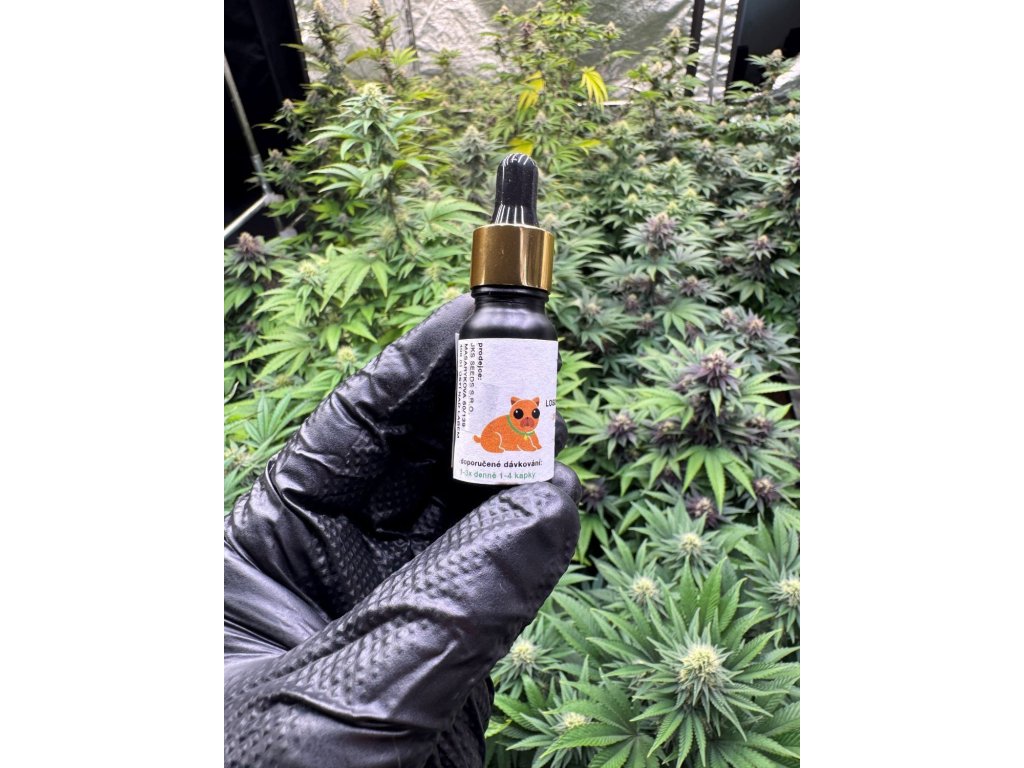 Lososový CBD olej pro psy, pro kočky a další domácí mazlíčky s 2,5 % CBD v 10ml nebo 30ml lahvičce s kapátkem.