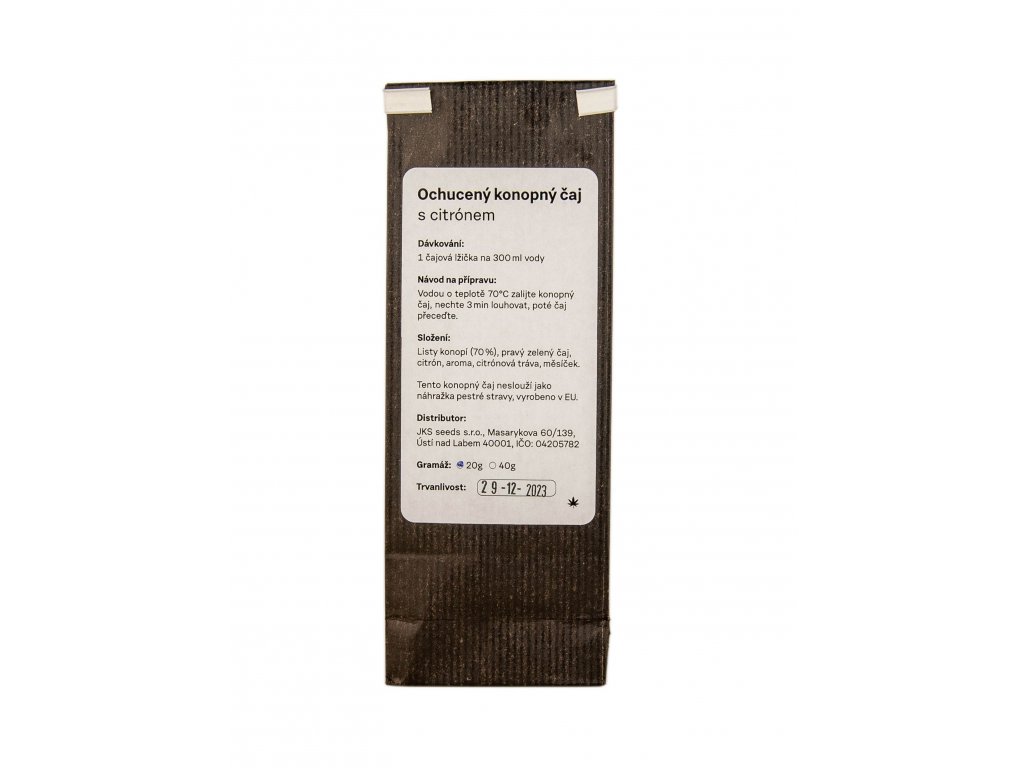 Ochucený konopný čaj s citrónem a přirozeným obsahem látek z konopí v balení po 20 nebo 40 gramech.