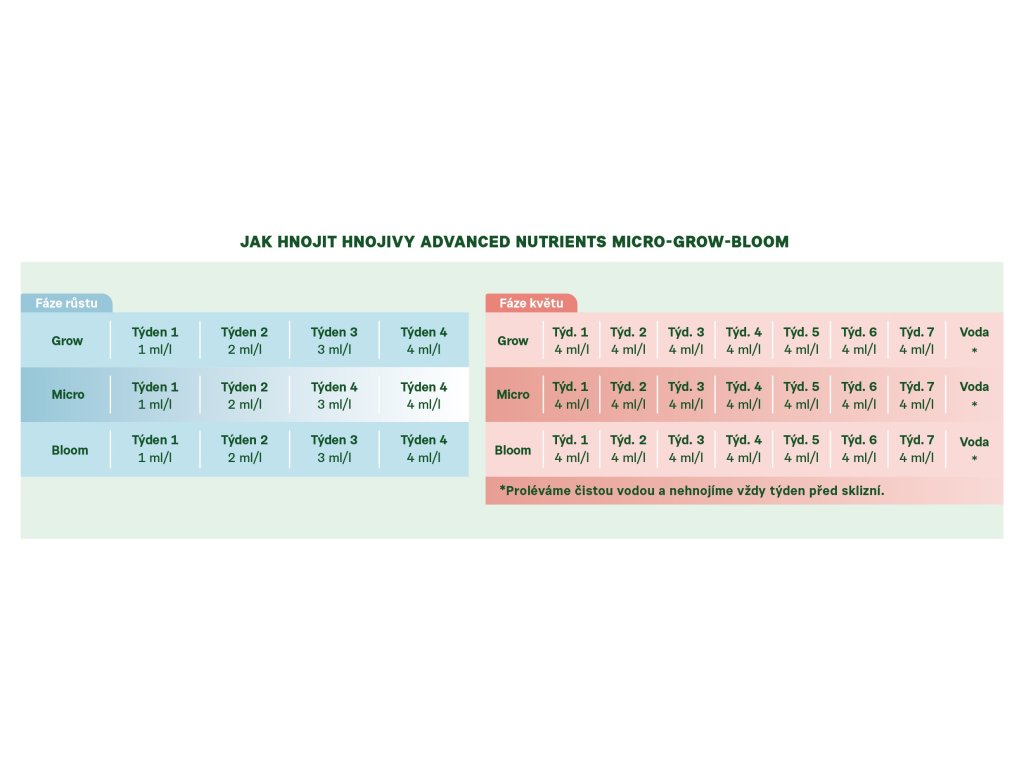 Hnojivo AN Grow-Micro-Bloom se používá od samého začátku pěstování, tedy již od fáze zakořeňování řezů / klonů plodin, či již první týden po vyklíčení semínek. V těchto ranných fázích používáme dávku o velikosti 1ml/1L. Během celé fáze růstu, tedy vegetace rostlin se dávka hnojiva zvyšuje na 2ml/1L. Po přechodu do květové fáze rostlin, lze hnojení zvýšit až na 4ml/1L zálivky. Hnojivo před použitím promíchejte a pro správnou funkčnost používejte vždy všechny tři složky. V počáteční fázi růstu je možné doplnit toto hnojivo o kořenový stimulátor např. Voodoo Juice a následně během květu nějaký booster s obsahem Fosforu (P) a Draslíku (K). Tato sada je tedy použitelná jak jako hnojivo na růst, tak i jako hnojivo na květ.