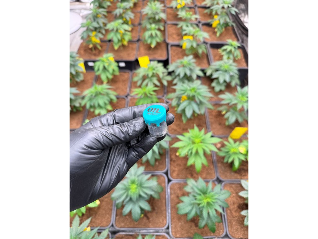 Skleněná schovka se silikonovým víčkem s logem o objemu 7 ml pro uchovávání bylinných extraktů bez přístupu vzduchu.