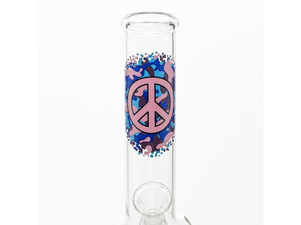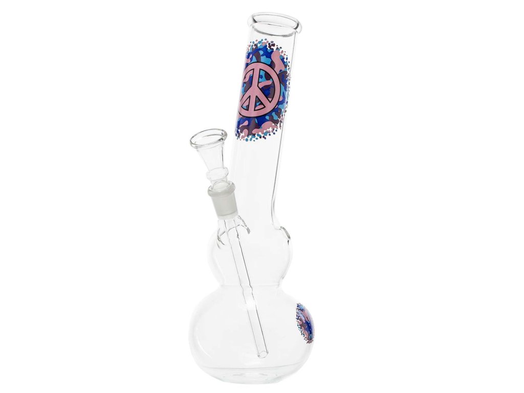 Skleněný bong s baňkou o velikosti 26 cm s originálním barevným potiskem. Bong má větší dvojitou baňku na vodu a je vybavený otvorem známým jako turbo. Malý nápaditý a velmi originální bong za super cenu. Toto skleněné bongo má průměr hubice 36 mm a průměr zábrusu 14,5 mm.