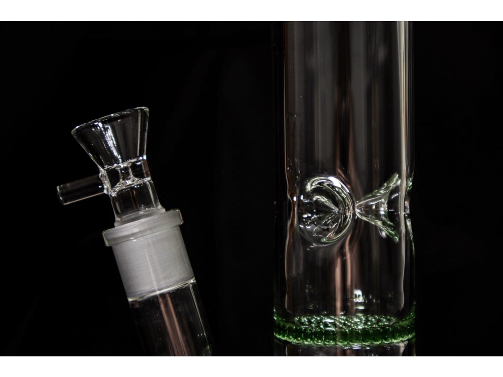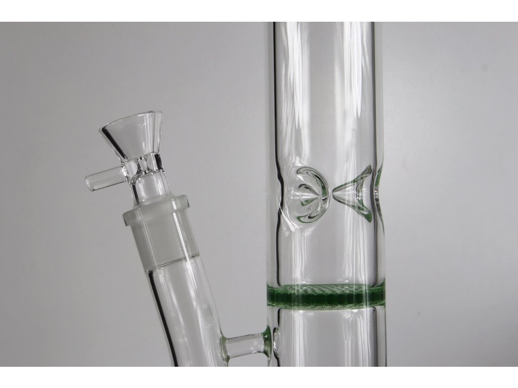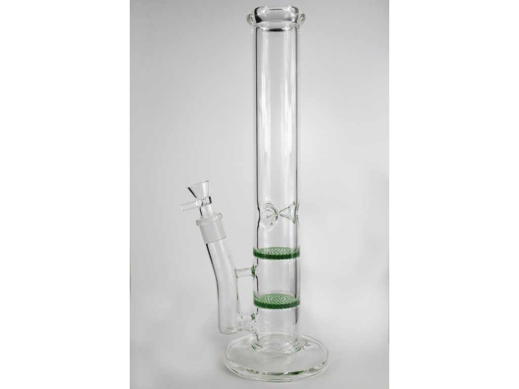 Skleněný bong se dvěma HoneyComb perkolátory v zelené barvě, vysoký 38 cm se zábrusy na led.