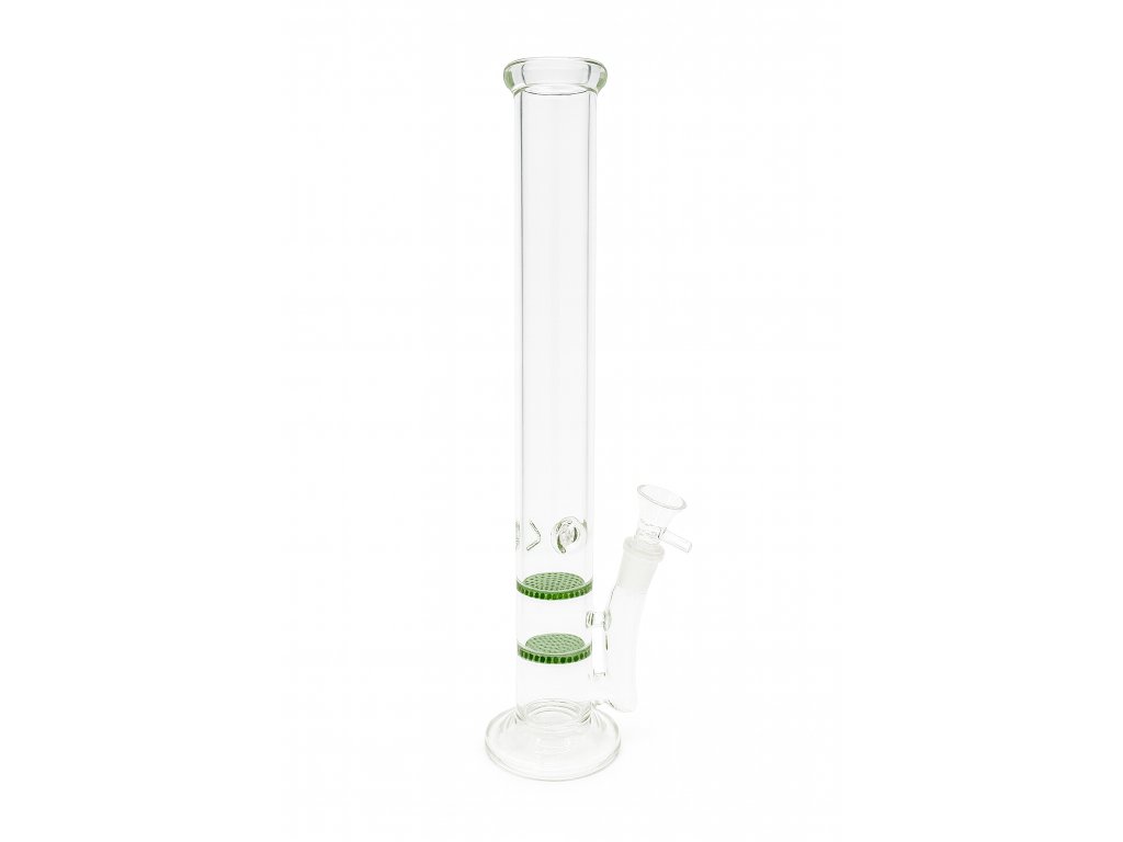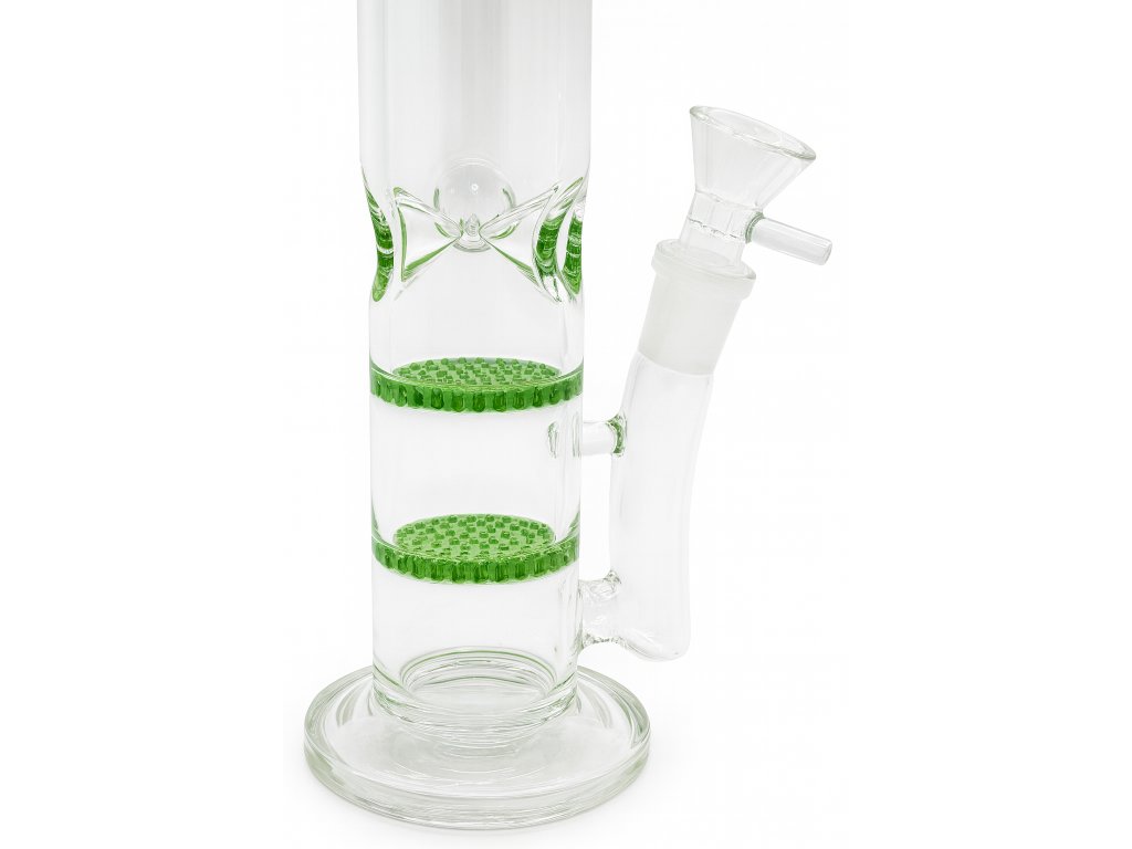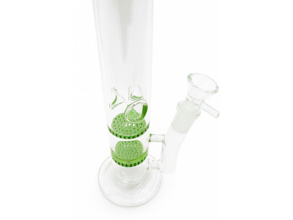 Skleněný bong se dvěma HoneyComb perkolátory v zelené barvě, vysoký 38 cm se zábrusy na led.