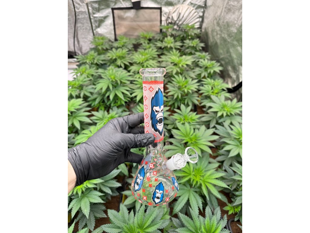 Skleněný Ice-bong o výšce 25 cm potěší každého, kdo hledá kompaktní, kvalitní a stylový bong s výrazným designem. Vyroben je z pevného skla, které zajišťuje odolnost a dlouhou životnost. Jeho tělo zdobí modrá opice 🐵doplněná o červené motivy hvězd a konopných listů, takže rozhodně nezapadne mezi obyčejné bongy. 🌟🍁