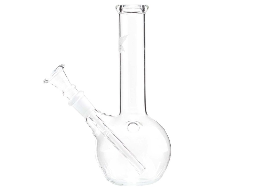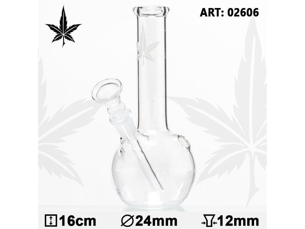 Skleněný mini bong o velikosti 16 cm s motivem konopného listu čiré barvě. Bong je vyroben ze skla a i přes malou velikost je vybaven turbem. Malý, ale účelný skleněný bong s originálním potiskem konopného listu.